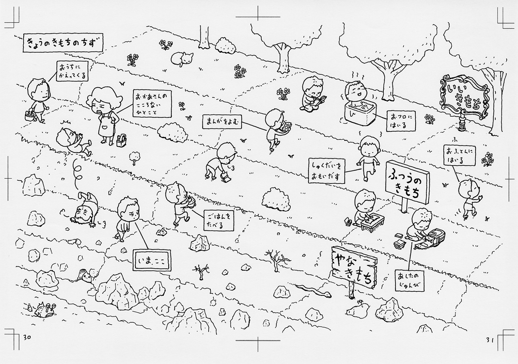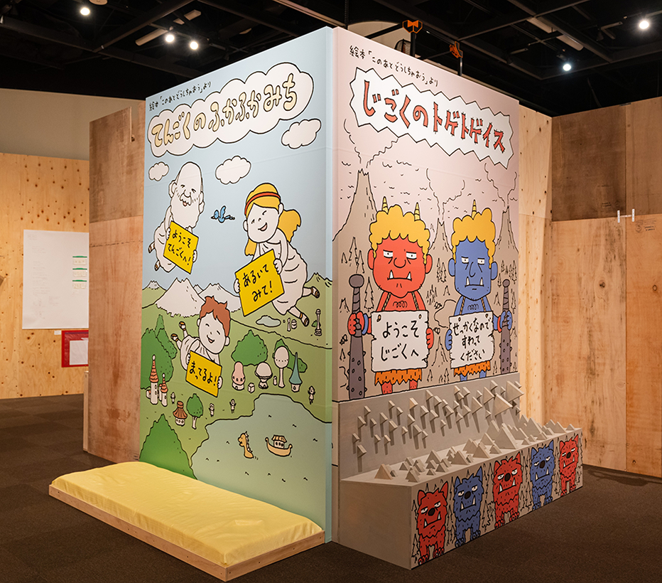 また、本展のためにヨシタケさんが考案した、うるさいおとなにりんごを投げるインタラクティブなアトラクションや、天国と地獄を味わえるふかふかの道とトゲトゲのイスなど、絵本の世界を体感できる仕掛けも会場の随所に設けます。